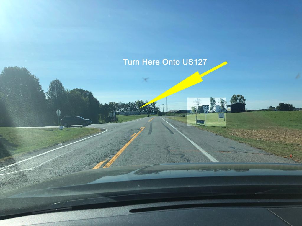 Six miles after exiting I-71 you will look for the intersection of US 127 and prepare to turn left onto US 127.